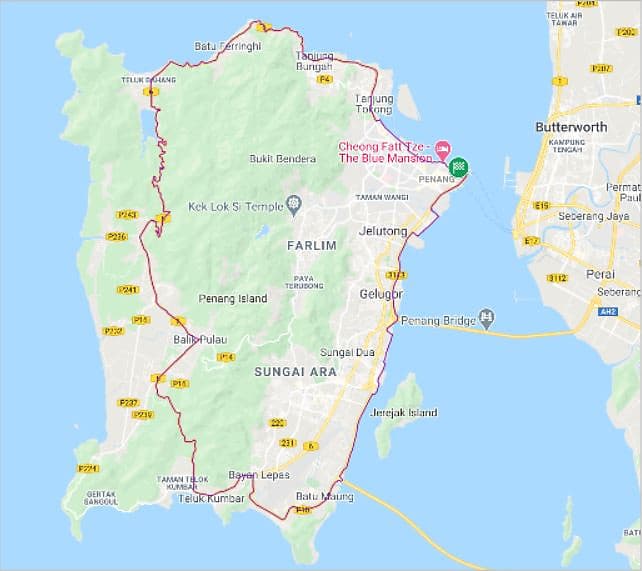 Route Description : After leaving the Esplanade and the Queen Victoria Memorial Clock Tower the route will proceed in an anticlockwise direction out along Gurney Drive and then on to Batu Ferringhi coastal road. It will pass some of Penang's iconic resorts like The Hard Rock and The Rasa Sayang as well as some of its famous tourist attractions like The Butterfly Park and The Escape at Teluk Batang. It will then climb up past the dam and into the Penang Central Hills aka Durian Country before descending down into Kuala Sungai Penang on the Islands West Coast. From here it will head to The Prince of Wales International's School (PoWIS) Secondary Campus just before Balik Pulau before continuing on into Pekan Genting. It will continue to the southern tip of the Island at Teluk Kumbar before heading eastwards back to Bayan Lepas. From here it will head south again to run around Penang Airport before heading north past Bukit Batu Maung, the 2nd & 1st Bridges and back into Georgetown.