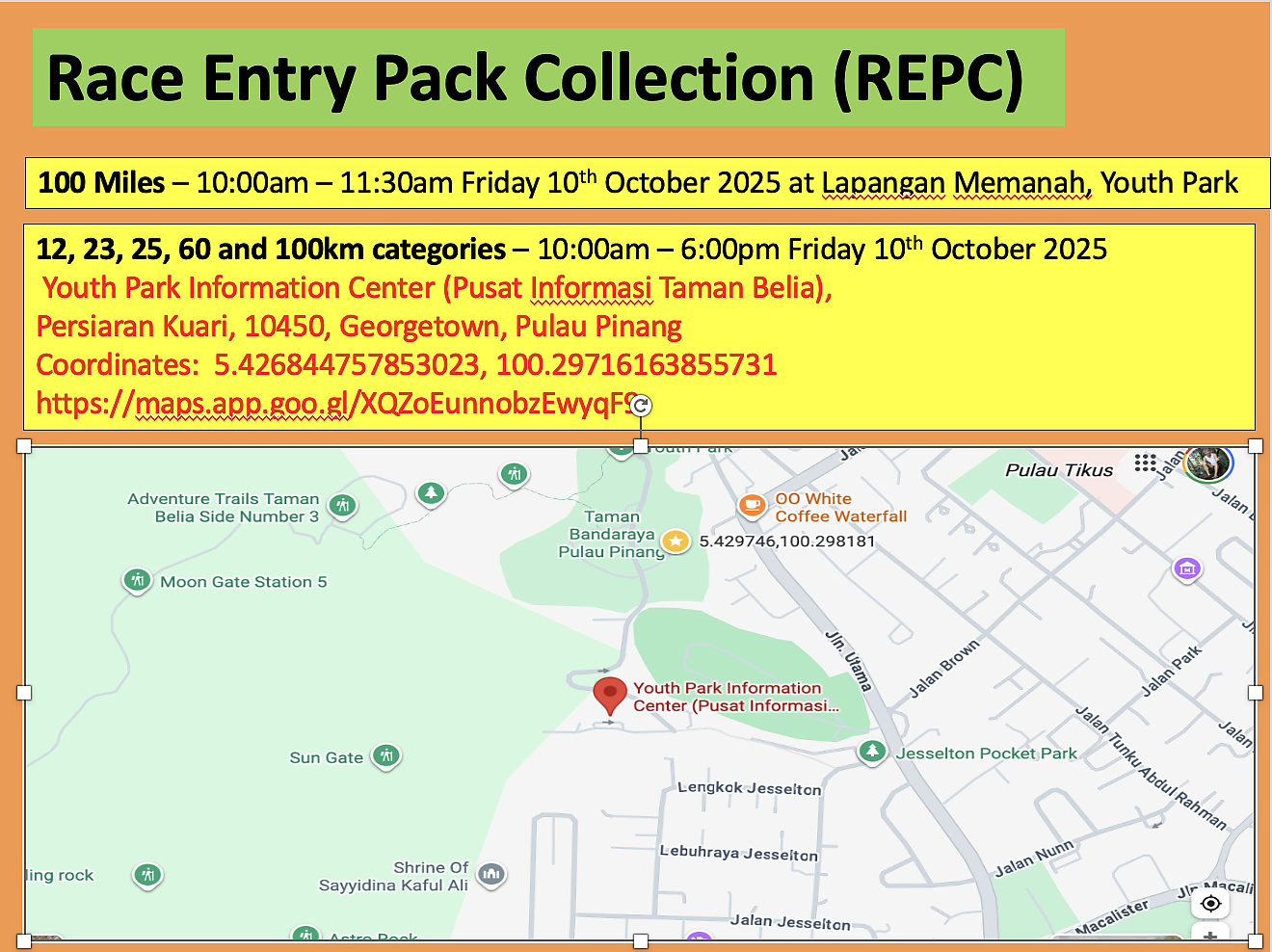 100Miles : You may collect them at Lapangan Memanah, Youth Park (starting venue) from 10:00am to 11:30am Fri 10th Oct 2025 before the 100miles race starts at 12.00pm Fri 10th Oct 2025