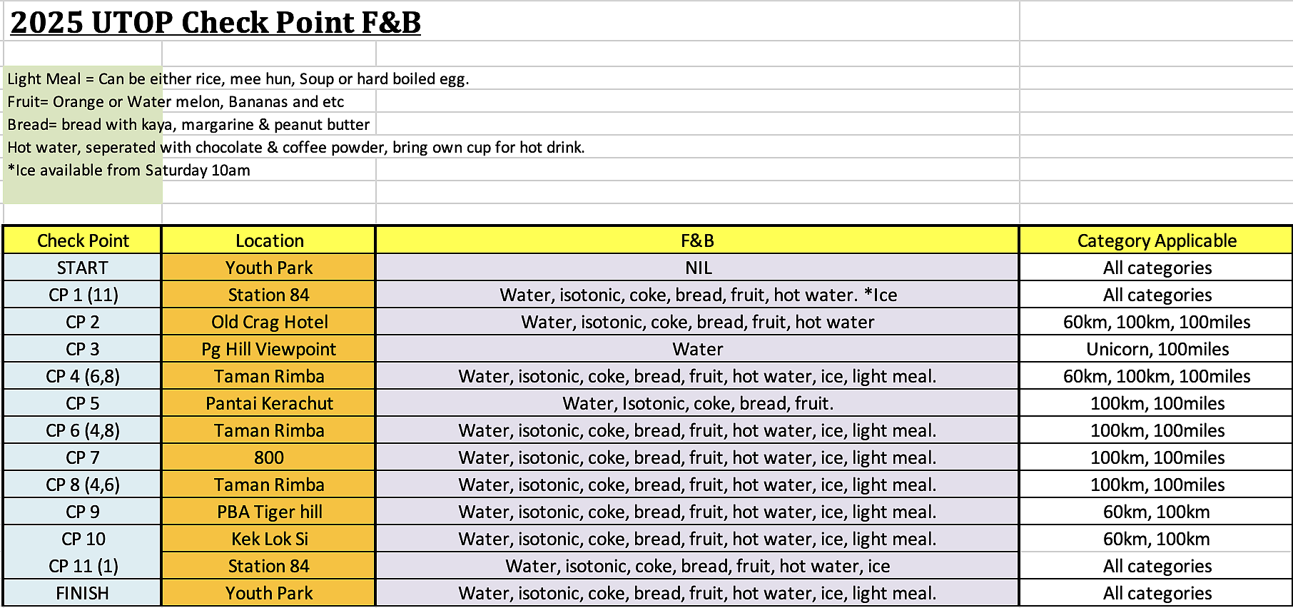 1. There is no drop bag for all categories except for 100 miles and 100km at Taman Rimba Teluk Bahang (CP4- 32km, CP6- 52km and CP8- 73km). These 3 CPs are in fact the same exact physical location;